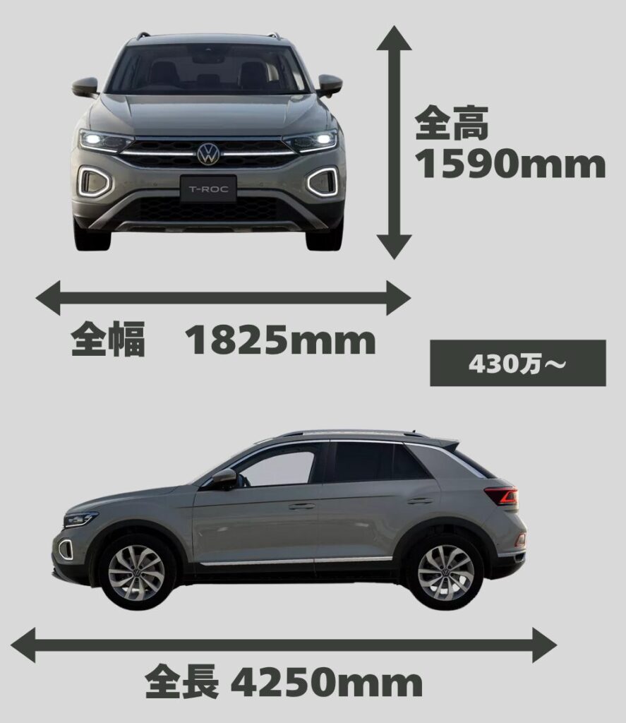 | T-Roc | クロスオーバーSUV | 4250 | 1825 | 1590 | 430 |