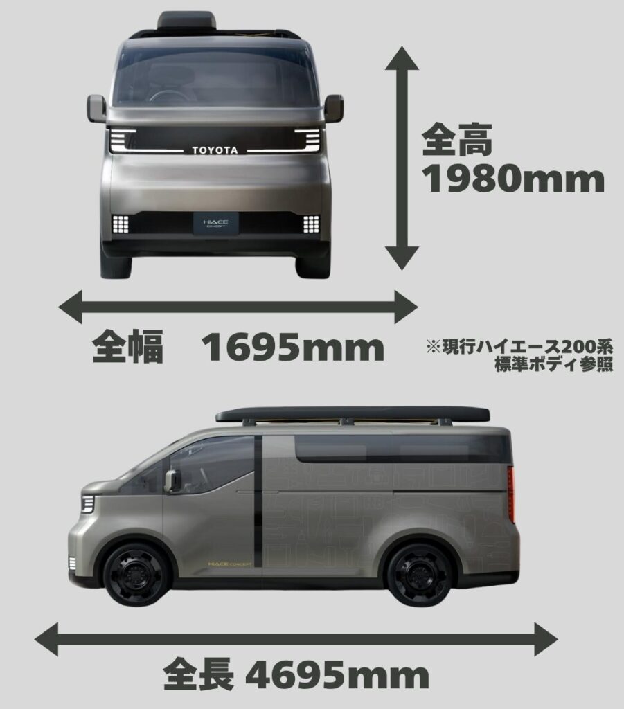 ハイエース コンセプトのサイズは25年11月3日時点で非公開ですので現行モデルを参考までに紹介します。
