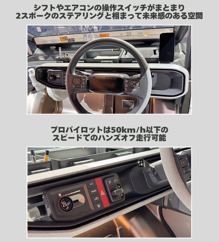 ステアリング周りでは、シフトやエアコンの操作スイッチがまとめて配置されています。これにより、運転に必要な操作が手元に集中し、未来感のあるすっきりとした空間が生まれています。2スポークのステアリングと相まって、洗練されたコックピットデザインです。
