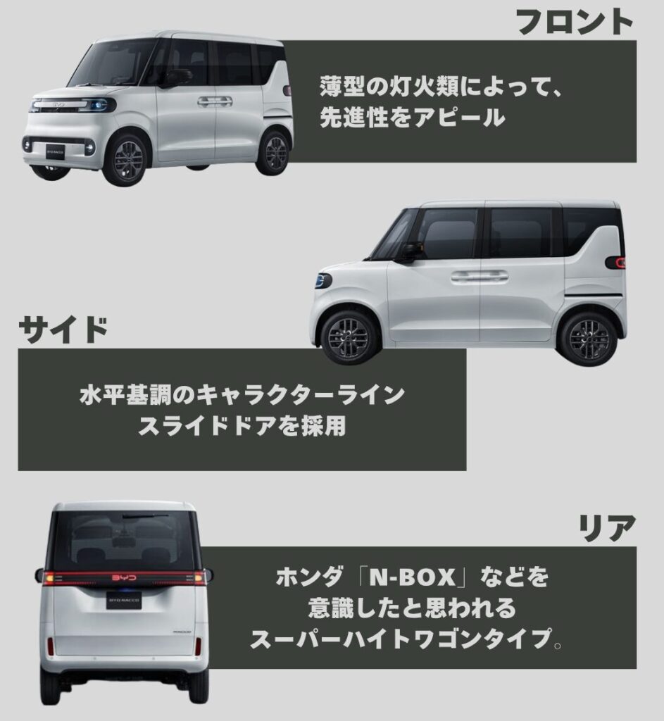 ããã¯BYDã«ãšã£ãŠåã®æµ·å€åžå Žå°çšèšèšã®ä¹çšè»ã§ãããæ¥æ¬åžå Žãžã®æ¬æ°åºŠã䌺ããŸããäžçã§æãå³ãããšãããæ¥æ¬ã®è»œèªåè»èŠæ ŒïŒå šé·3.4m以äžãå šå¹ 1.48m以äžãå šé«2.0m以äžãææ°é660cc以äžãªã©ïŒã«ãã£ã¡ãåãããŠéçºãããç¹ãæå€§ã®æ³šç®ãã€ã³ãã§ãã