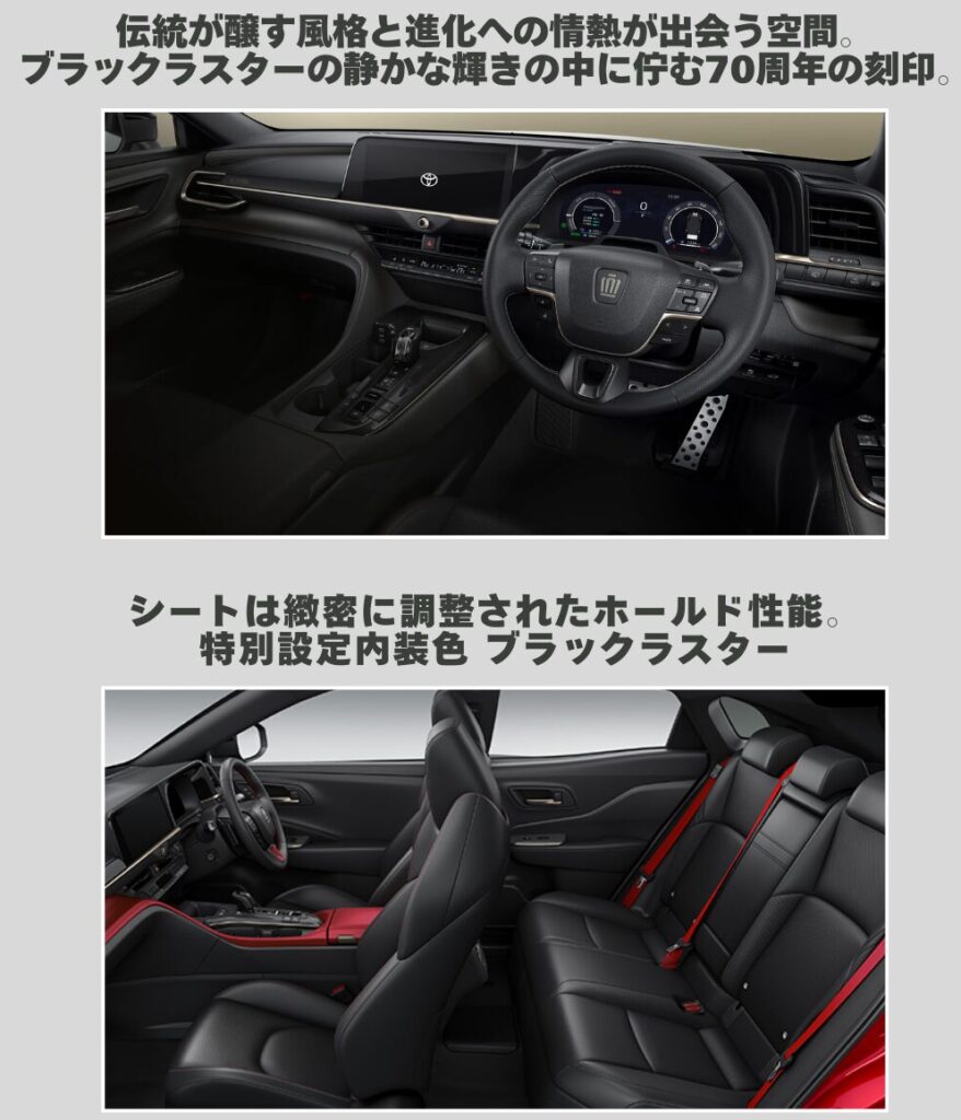 • バイトーンのボディカラー: ルーフ(屋根)部分はブラック、ボディはマットメタルという2トーン構成が、クラウンの歴史を継承しつつもモダンな印象を与えます。