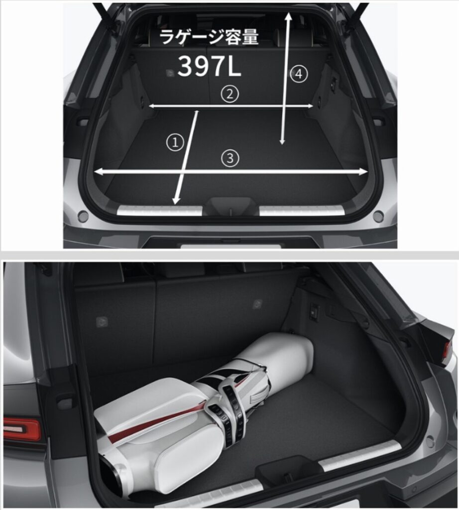 正直に言いますと、この数値は「めちゃくちゃ広い」わけではありません。デザイン優先のスタイリッシュなSUVなので、箱型のミニバンのような積載量は期待しないでください。