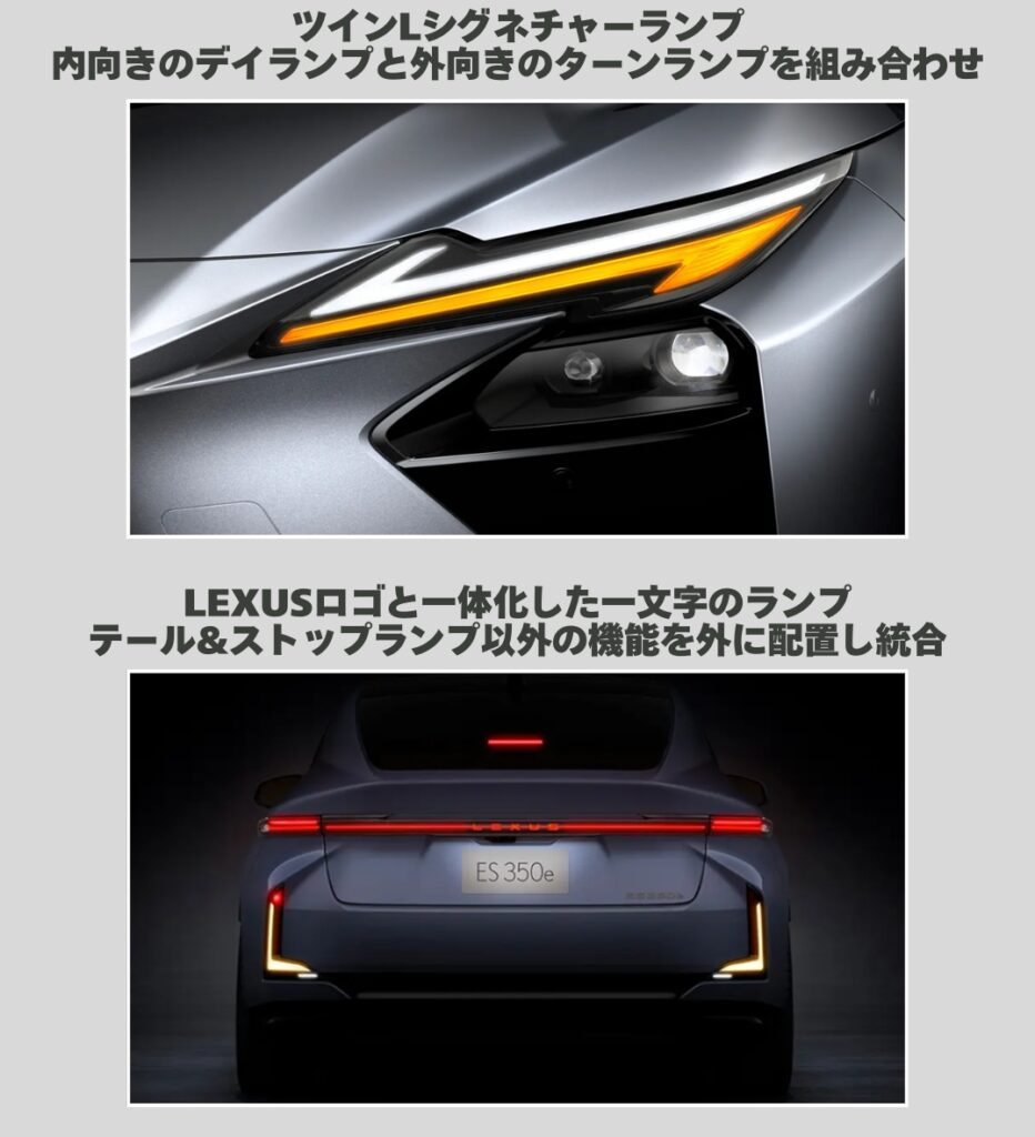 まず目を引くのが、フロントの「ツインLシグネチャーランプ」です。内側を向いたデイライトと、外側を向いたターンランプが組み合わされており、昼夜を問わず、レクサスらしいシャープで洗練された表情を作り出しています。