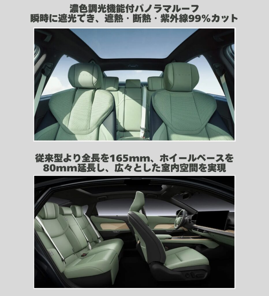 また、特筆すべきは「調光機能付パノラマルーフ」です。光の量を瞬時に調整できる機能で、強い日差しを遮ったり、断熱・遮熱効果を発揮したりと、室内の快適性を高めます。さらに、紫外線も99%カットしてくれるので、美容意識の高い方や小さなお子様がいるご家庭にも嬉しい機能です。