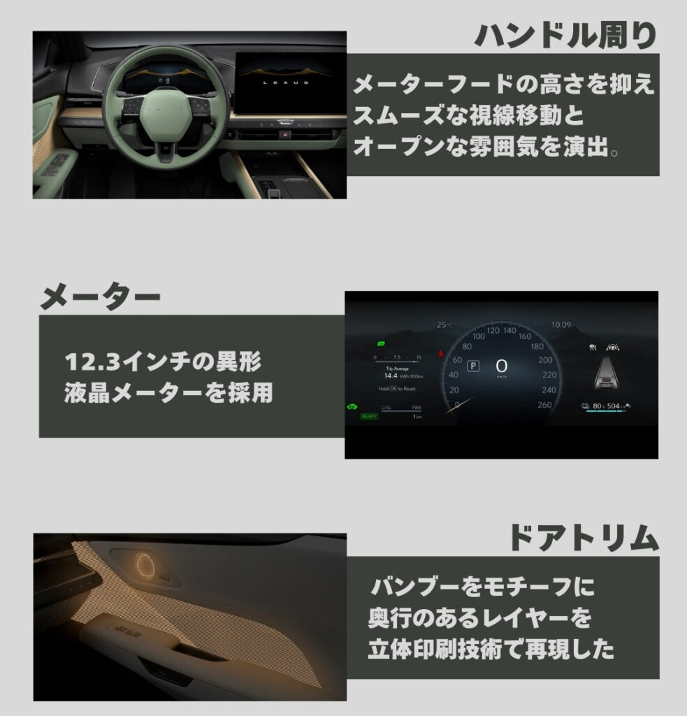 そして、リアビューでは「LEXUSロゴと一体化した一文字のランプ」が特徴です。テールランプとストップランプ以外の機能を外に配置し、統合することで、シンプルでありながらも未来的なデザインを実現。夜間でも一目でレクサスとわかる、圧倒的な存在感を放ちます。