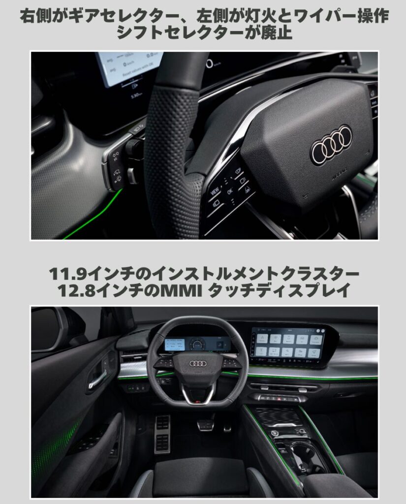 また、操作系も進化しており、ステアリングホイールには、右側がギアセレクター、左側が灯火とワイパー操作が集約され、以前のようなシフトセレクターは廃止されています。これにより、センターコンソール周りがスッキリとし、モダンな印象を与えます。