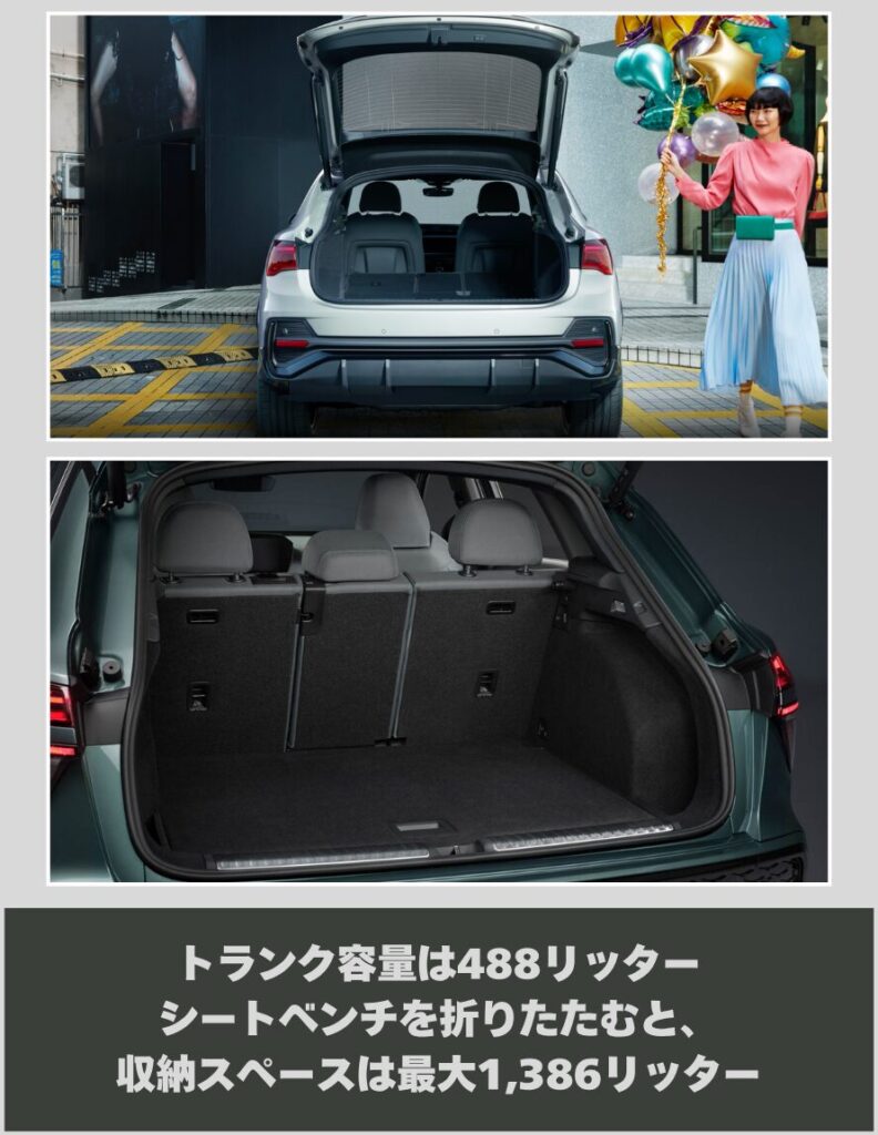 新型Q3のトランク容量は488リットルと、日常使いには十分なサイズを確保しています。さらに、後部座席のシートベンチを折りたたむと、収納スペースは最大1,386リットルにまで拡大します。この大容量があれば、キャンプ用品や趣味の道具も楽々積み込めますね。