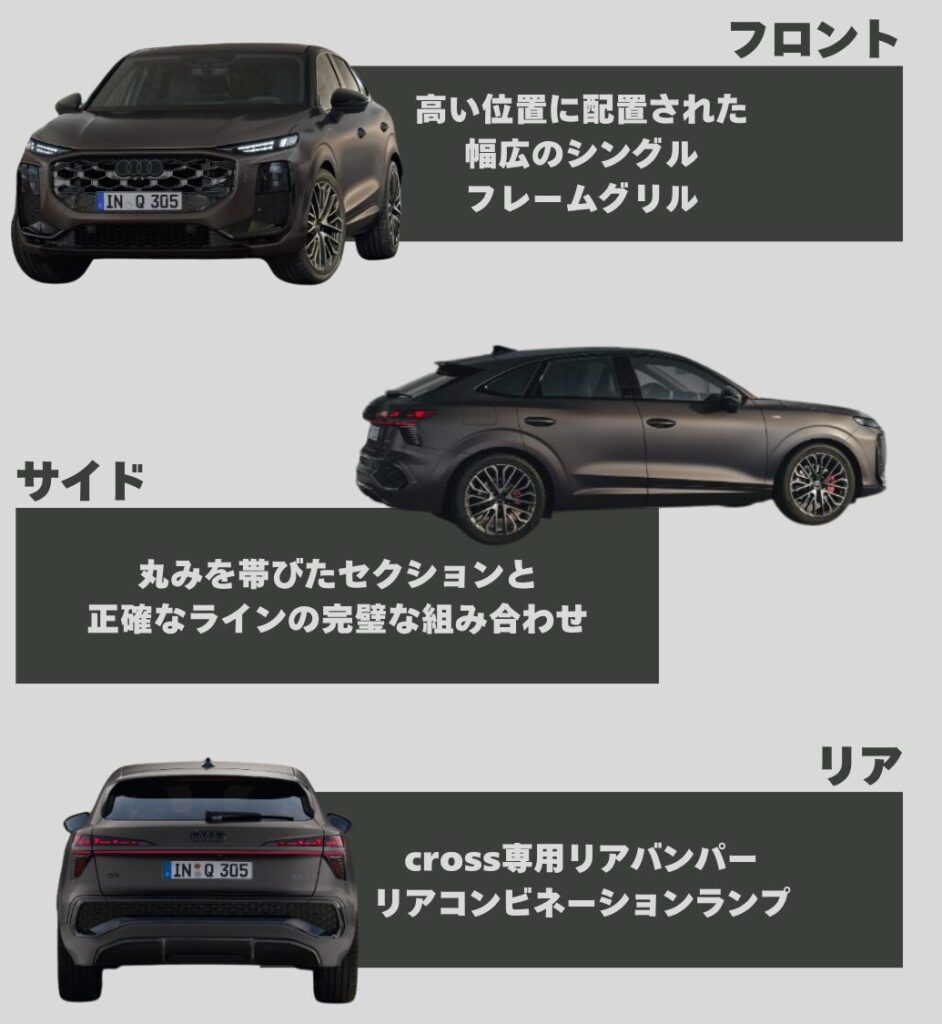 - スポーツバック:Q3 Sportback。クーペのようなスポーティな外観が特徴で、デザイン性を重視する方におすすめです。