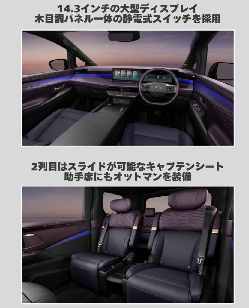 - インパネ周り:運転席前には、最新の情報を表示する14.3インチの大型ディスプレイを搭載。さらに、木目調パネルと一体になった静電式スイッチを採用しており、先進性と上質感が両立しています。