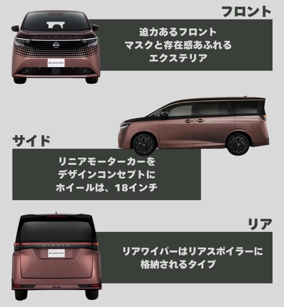 新型エルグランドのエクステリアは、まさに「プレミアムミニバン」という名にふさわしい、迫力と上質感を兼ね備えています。