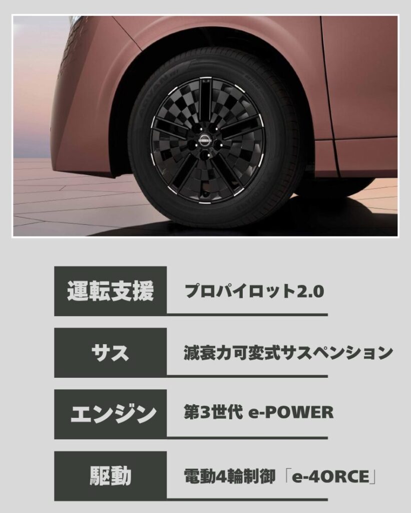 - エンジン:日産の第3世代となるe-POWERを搭載。エンジンは発電に徹し、モーターで走行するため、ミニバンとは思えない静かで滑らかな走りを実現します。