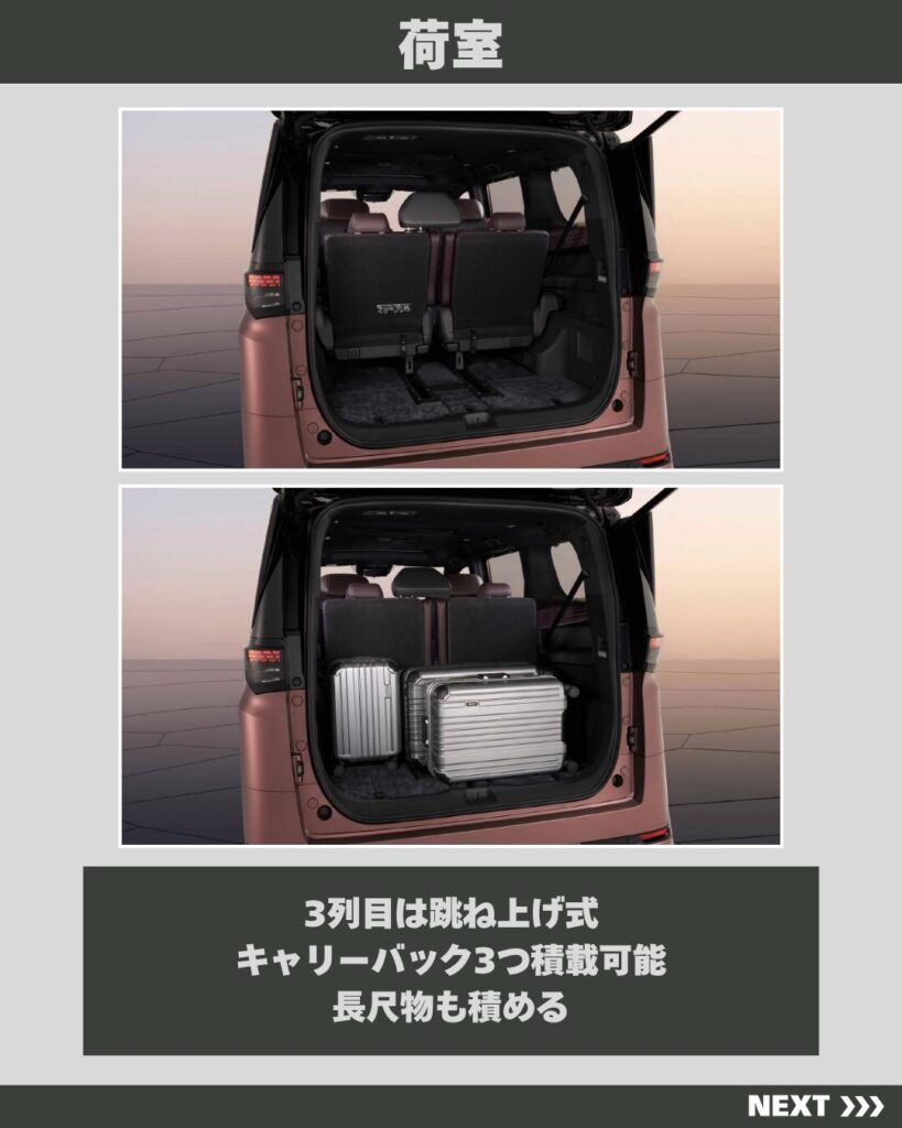 - 積載能力:画像からもわかるように、3列目を跳ね上げた状態であれば、キャリーバッグが3つ余裕で積載可能。キャンプ用の大型コンテナやテント、スキー板などの長尺物も、安心して積むことができます。