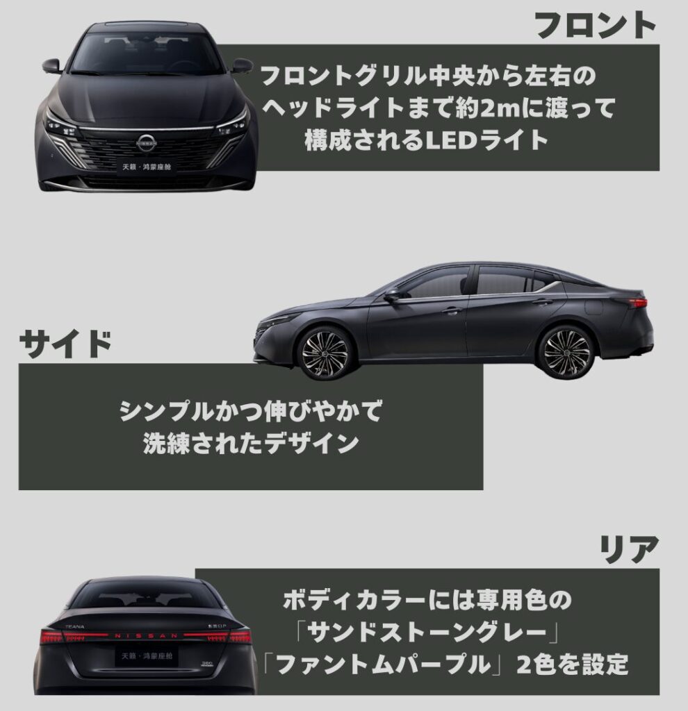 新型ティアナの最大の特徴は、フロントグリル中央から左右のヘッドライトまで約2mにも渡って構成されるLEDライトです。
