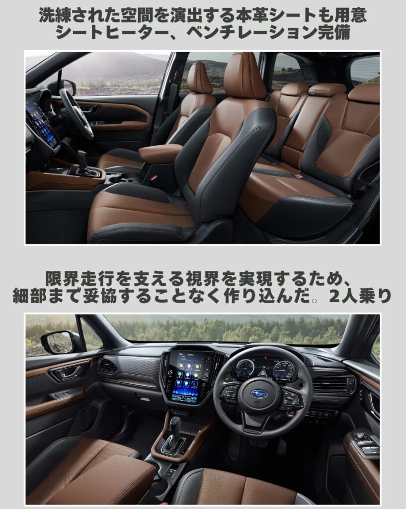 さらに、「限界走行を支える視界を実現」するために、ピラー(柱)の位置やダッシュボードの形状が工夫されています。スバル車特有の「0次安全(乗った瞬間から安全)」の思想ですね。視界が良いということは、それだけ運転疲れが軽減されるということです。