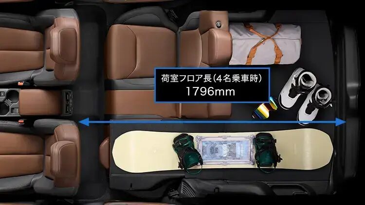 後席を倒せば、荷室フロア長は1,796mmまで拡大します。スノーボードやスキー板も中積みが可能ですし、車中泊も工夫次第で十分に楽しめそうです。ゴルフバッグも横向きに積載可能な幅広設計は嬉しいですね。
