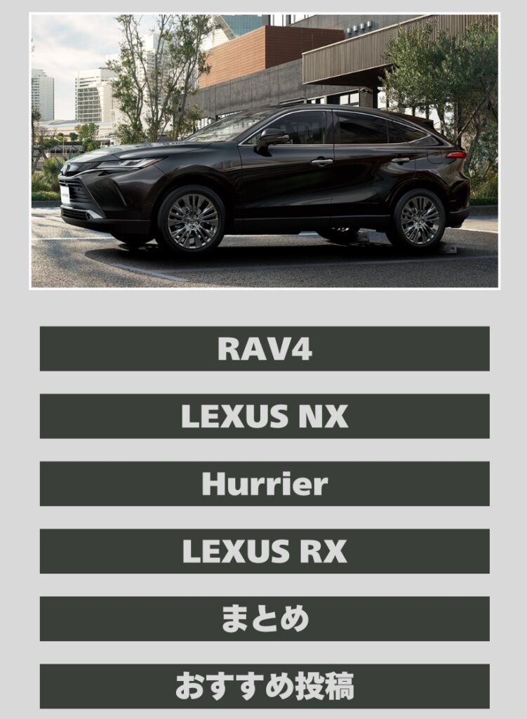 特に、絶大な人気を誇るトヨタと、その高級ブランドであるレクサスのSUV。街で見かけることも多く、「RAV4とハリアーって似てるけど何が違うの?」「NXとRX、どっちが自分に合ってるんだろう?」と感じている方も多いはず。