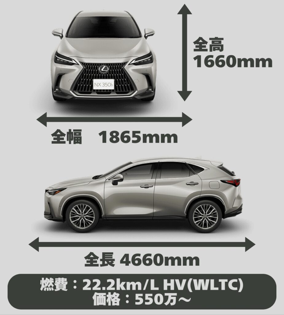 レクサス NX | 1,865mm | 4,660mm | 1,660mm | 550万円〜 |