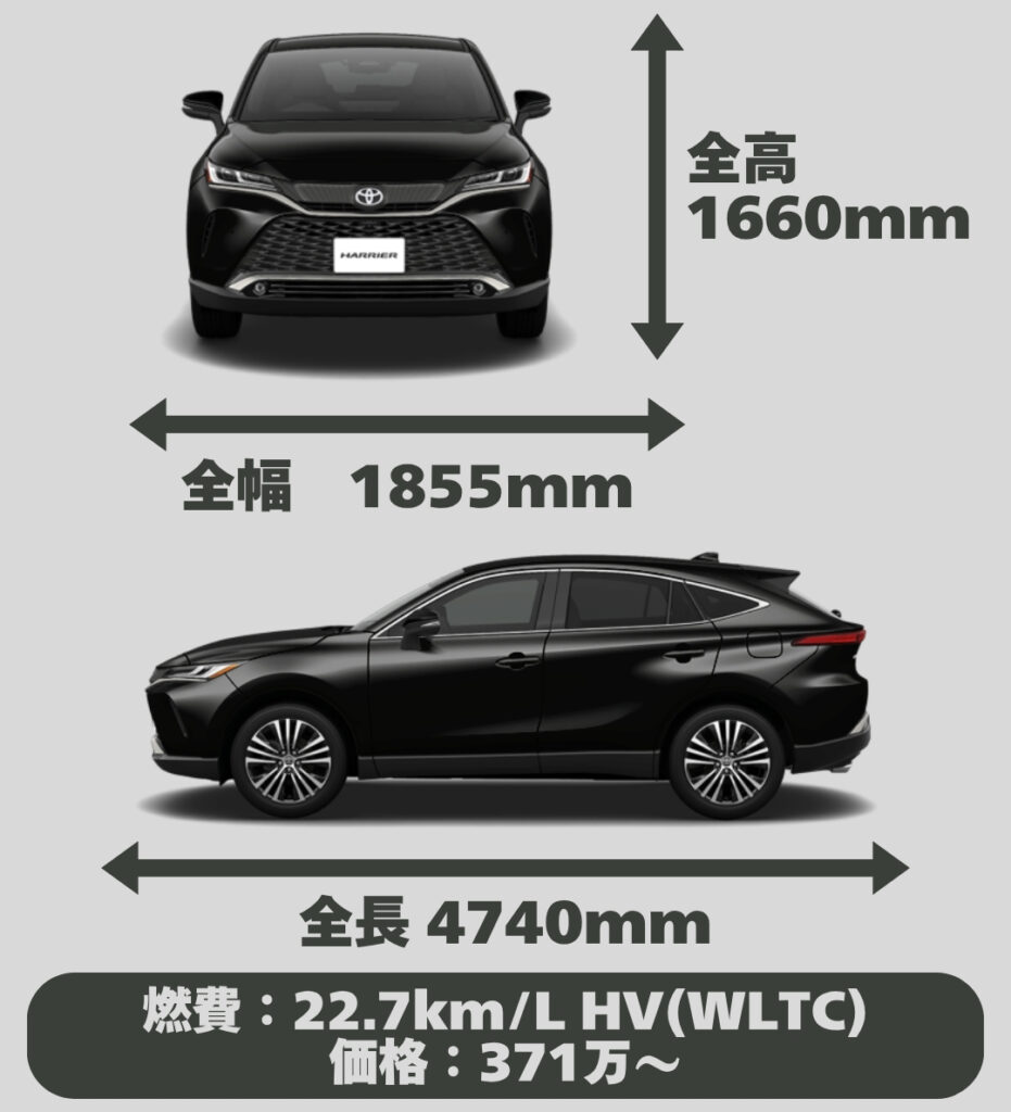 トヨタ ハリアー | 1,855mm | 4,740mm | 1,660mm | 371万円〜 |
