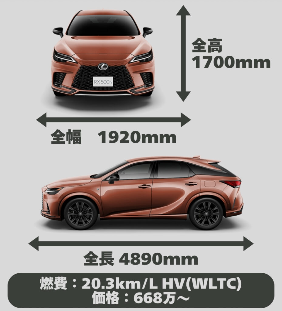 レクサス RX | 1,920mm | 4,890mm | 1,700mm | 668万円〜 |